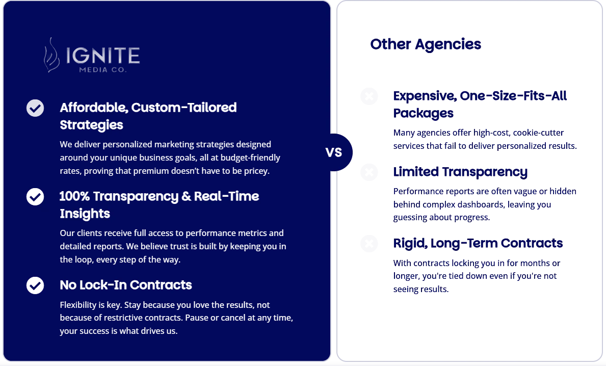 Great question and honestly, it’s the most common concern we hear. The truth is, most businesses fail with marketing because they’re working with generalists, using one-size-fits-all strategies, or trying to piece everything together themselves. That never works long term. At Ignite Your Media, we don’t guess. We use data-backed strategies, high-converting funnels, and hands-on optimization tailored specifically to your business, industry, and goals. This isn’t theory it’s execution built to generate real ROI.