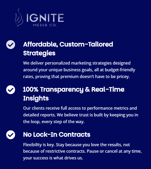 You clicked this ad for a reason you’re tired of doing all the right things and still not seeing growth. At Ignite Your Media, we specialize in helping business owners like you dominate online with done-for-you digital marketing that brings measurable results not just followers, but leads, sales, and growth.